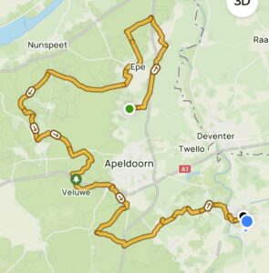 Wij hadden in eerste instantie 1 route uitgezet maar die werd wel wat lang te weten 127,5 km dat is de gele route. De route wat ingekort mis je wel een mooi gedeelte op de noordelijke Veluwe. De ingekorte route is 102,6 km dat is de paarse route. Heb beide routes op papier staan, dus men kan zelf kiezen wat te rijden, dat is weer eens iets nieuws bij Cabriofun en verandering van spijs doet eten. . Beide routes gaan een stukje langs het Apeldoornsch kanaal en buigen dan af richting de bossen op de Veluwe.